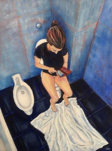 2020Model in badkamer, in contact met buitenwereld tijdens quarantaine. Woman figure in bathroom, connecting the outside world during lockdown.